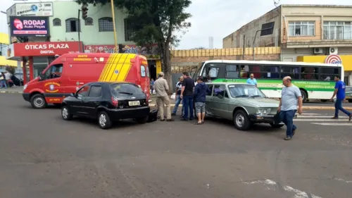Uma mulher escapou de ser atropelada após acidente entre dois carros no centro de Ivaiporã na manhã desta terça-feira (13). Ela estava na calçada e ia atravessar a rua, quando uma Brasília atingiu um Celta.