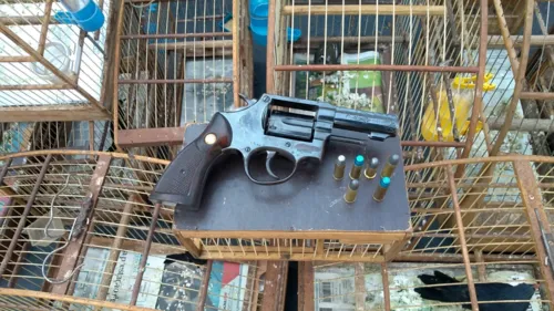 Foi localizado na cintura do indivíduo, um revólver calibre 38 com numeração suprimida, seis munições intactas. Na casa também foi encontrado várias gaiolas com diversos pássaros, e ainda 13 gaiolas, quatro armadilhas, e três transportadora de aves.
