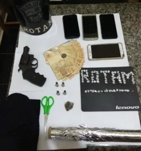 Ainda em buscas na residência do casal, foram localizados e apreendidos vários objetos idênticos aos que foram embaladas as pedras de crack. Também foram apreendidos quatro celulares, uma carteira com documentos, uma touca ninja, e o dinheiro que estava com os abordados.