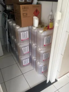 Dentro do imóvel foram encontradas dezenas de galões de 5 e de 20 litros de vários tipos, como herbicidas, acaricidas, Roundup, Aplicbem e Diurom. Havia também uma espingarda de calibre .36, um revólver, uma pistola de calibre .380 e várias munições. Todo o material foi entregue à Polícia Civil da cidade para os devidos procedimentos.