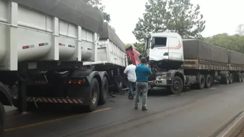 Uma colisão na manhã desta quarta-feira (11) entre duas carretas na PR-466 deixa a pista parcialmente interditada nas proximidades da subestação de Furnas.