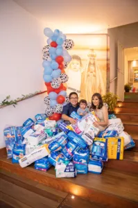 "Nosso filho já tinha tudo que precisava, e graças a Deus é muito saudável, e é sempre uma preocupação dos convidados, o que dar de presente para uma criança de um ano. Então ligamos no lar São Vicente de nossa cidade e perguntamos o que eles mais precisavam, então decidimos colocar no convite, que os convidados deveriam levar as fraldas, e poder junto contribuir com o próximo", explica o pai.