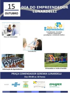 A prefeitura de Lunardelli, em parceria com o Sebrae, Comitê Gestor Lunardelli, Emater e Sala do Empreendedor, realiza amanhã, terça-feira, dia 15, o DIA DO EMPREENDEDOR LUNARDELLI, que oferecerá diversos serviços gratuitos para pequenos empresários e para quem deseja empreender.