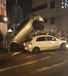 Um carro foi parar em cima de outro depois de um acidente em um cruzamento no Centro de Ponta Grossa, na região dos Campos Gerais do Paraná, na madrugada deste sábado (26). Segundo o Corpo de Bombeiros, um dos motoristas teve ferimentos leves e o outro não se machucou.