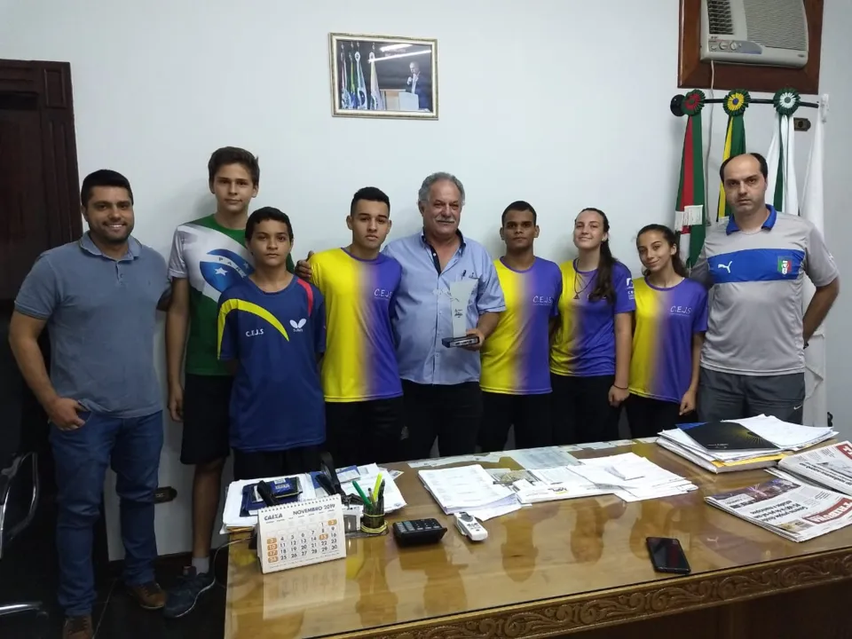 O prefeito Ditão acompanhado do Coordenador do Esportes do Município Geraldo Bezerra e do Vereador André Saddi receberam na tarde desta quarta-feira (6), professor Rodrigo Dorabiato (Todd) e os atletas da modalidade de Tênis de Mesa ( equipe do Colégio Estadual que representou o Município no JAVIS).