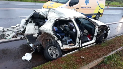 A vítima fatal estava no banco traseiro do carro e ficou presa entre as ferragens. Ainda no veículo com placas de Dois Vizinhos, Sudoeste do Paraná, estavam outros dois homens, que sofreram ferimentos graves.