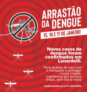 A prefeitura de Lunardelli, através da secretaria municipal de Saúde, promove nos dias 15, 16 e 17 de janeiro o Arrastão contra a Dengue, com o lema “Combater a Dengue é um dever meu, seu e de todos”. O objetivo é eliminar os locais que acumulam água e que são criadouros do mosquito transmissor.