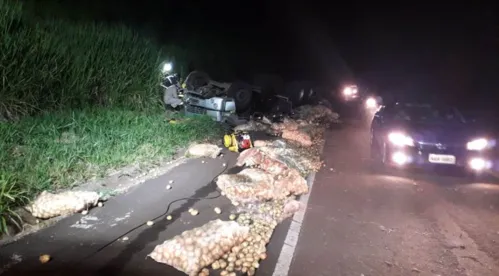 O caminhão estava carregado de batatas e a carga ficou espalhada na rodovia. A Polícia Rodoviária Estadual foi acionada e ajudou a sinalizar a pista.