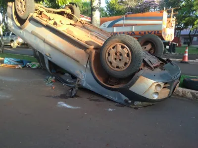 Um carro capotou e ficou de ponta cabeça na manha desta quinta-feira (13), em Manoel Ribas. O acidente aconteceu por volta das 6h30 na Rua XV de Novembro, em frente a Igreja Matriz.
