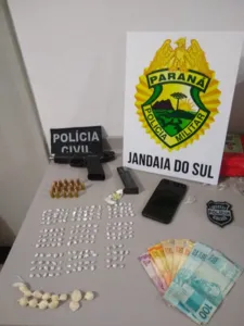 Na casa do suspeito, no quarto dele, foi encontrado uma pistola calibre 9 milímetros e 16 munições. Já em uma das gavetas do guarda-roupas, a PM localizou diversos pacotes com poções de crack dentro. Foram apreendidas 173 pedras, já preparadas para a venda.