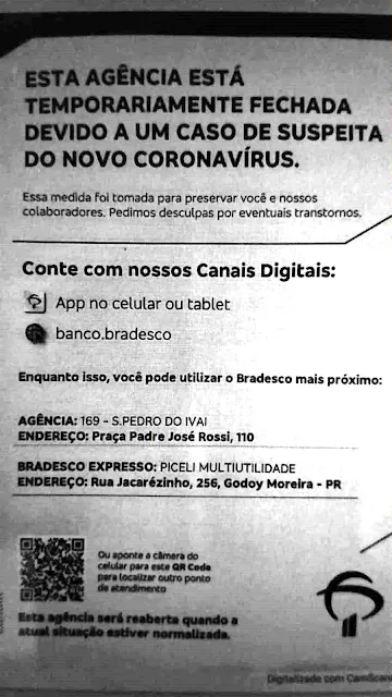 Conforme informações do Canal HP de São João do Ivaí, um comunicado fixado na porta da agência do Bradesco de São João do Ivaí alarmou a população no início da noite de segunda-feira (06). No cabeçalho fixado na porta da agência o título "Esta agência está temporariamente fechada devido a um caso de suspeita do novo coronavírus".