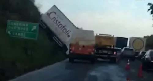 A cabine do caminhão acabou ficando totalmente esmagada, mas o motorista conseguiu sair sem ferimentos.