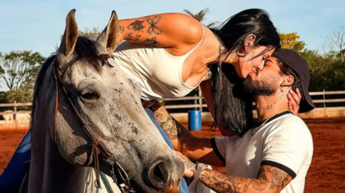 Na imagem, Ana aparece montada a cavalo enquanto dá um beijo no namorado. Na legenda, Zé Felipe abriu o coração: