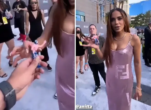 O que chamou a atenção é que, antes do evento começar, um deles deu um "boneco da sorte" para Anitta e a reação dela viralizou na internet.