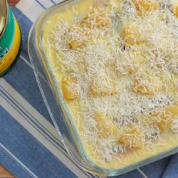 Cobertura: Coco ralado fresco e fatias ou pedaços de abacaxi em calda.