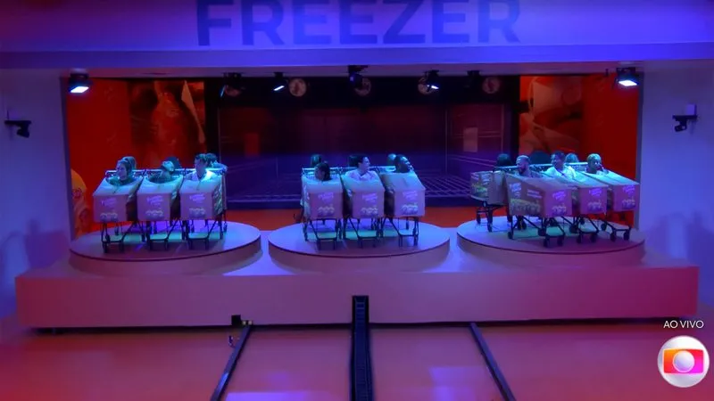 Dentro de carrinhos de supermercados que estão girando, os brothers ficam apenas com a cabeça para fora e passam por três estações - freezer, air fryer e forno. O público pode votar e decidir onde eles ficarão.