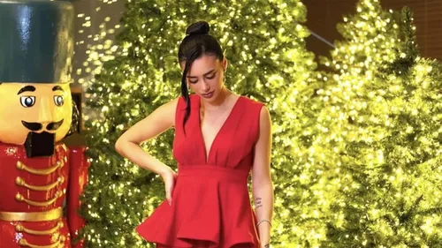 Por fim, a namorada de Neymar usou um look que disfarça a barriga durante a festa de Natal na mansão do atleta. Ela apareceu com um vestido vermelho com babados na região da cintura para não marcar sua nova silhueta.