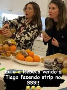 Na imagem, publicada nos stories do Instagram da líder do "Vem Pra Cá", as duas irmãs aparecem com a boca aberta e um semblante de choque. "Eu e a Rebeca vendo o Tiago fazendo strip no BBB", escreveu ela na legenda da imagem acompanhado de emojis de risada.