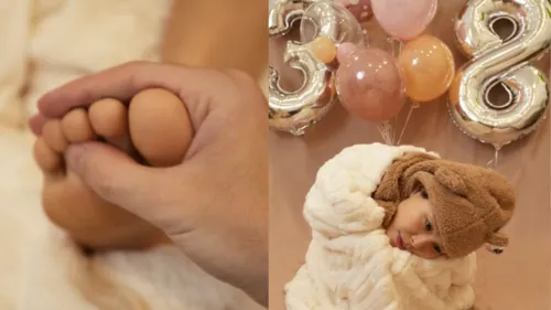 No ensaio, a influenciadora recriou poses clássicas desse tipo de fotografia, como mãos apoiadas no rosto e o olhar distante. Em outra imagem, uma mão masculina aparece segurando seu pé, em referência às fotos tradicionais com recém-nascidos. Em tom irreverente, ela também incluiu detalhes como expressão relaxada e até um leve traço de baba, reforçando a proposta divertida da produção.