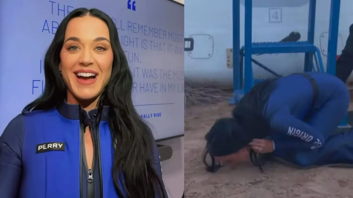 A cantora Katy Perry beijou o chão após retornar da viagem espacial promovida pela Blue Origin, nesta segunda-feira (14). A empresa astronáutica e serviços de voo espacial suborbital lançou com sucesso, a nave New Shepard para uma viagem de turismo espacial com 6 mulheres a bordo, incluindo a cantora.