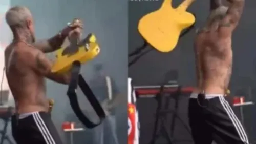 O momento, registrado no fim da apresentação, chamou atenção após o artista tentar, sem sucesso, quebrar uma guitarra no palco, cena que rapidamente virou alvo de comentários e brincadeiras entre internautas.