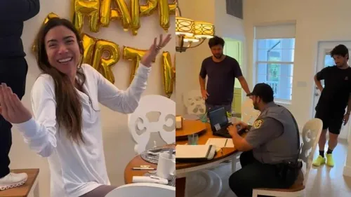Bem-humorada, a aniversariante apareceu dando risada enquanto atendia a autoridade com seu marido, o político Fábio Faria. A irmã então comentou enquanto gravava o momento que estavam arrumando a festinha e relatando um roubou de um carro para o policial.