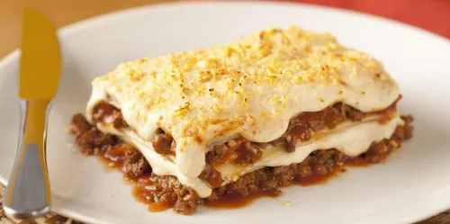 Em um recipiente refratário (20 x 30 cm), coloque uma porção de molho bolonhesa; cubra com uma camada de massa, e uma porção de molho branco e coloque o queijo mozarela. Repita as camadas até a borda do recipiente.