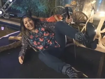 Roberta Miranda levou um tombo após mais de duas horas de sua live, na qual transformou a apresentação em um arraial junino. Ela se desequilibrou ao sentar em uma fogueira cenográfica.
