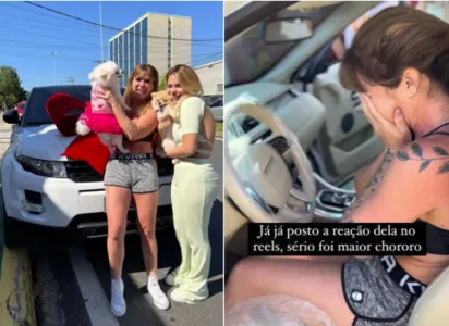 Ela mostrou várias imagens de Viviane emocionada, chorando dentro do automóvel, um Land Rover Evoque zero quilômetro, ainda com os bancos de couro protegidos com plásticos - o modelo 2022 começa em R$ 400 mil. "Sério, foi o maior chororô", disse Viih, que posou com Viviane e o cachorrinho da família em frente ao veículo, devidamente decorado com um laço vermelho gigante.