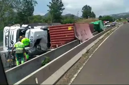 Um dos veículos de carga tombou sobre a rodovia; vítima foi socorrida pela equipe