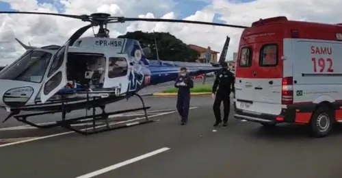 Dada gravidade em uma das vítimas, o SAMU pediu apoio de Resgate Aéreo de Maringá. Veja o momento da saída do helicóptero com uma vítima sendo transportada - entubada, para o Hospital Norte do Paraná (Honpar), com traumatismo craniano.