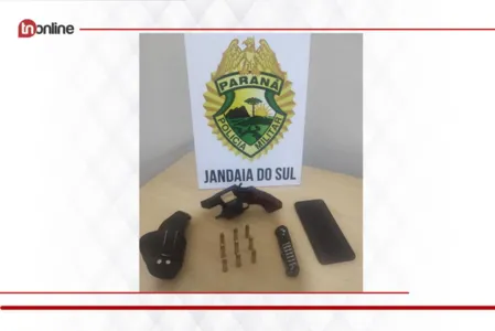 Um homem foi preso pela PM neste domingo (06), às 21h em Jandaia do Sul, no centro da cidade por posse irregular de arma de fogo, acessório ou munição de uso permitido. Ele foi detido em flagrante após ameaçar a esposa com um revólver calibre .38 na cintura. Até tentou fugir, mas foi pego com a arma carregada com 5 munições intactas.