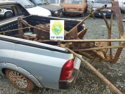 Os PMs revistaram os veículos e os suspeitos foram presos após entrarem em contradição sobre um equipamento agrícola de arado na carroceria da Montana. Um deles, disse que achou o implemento abandonado e o outro que a dona da propriedade tinha lhes dado o arado.