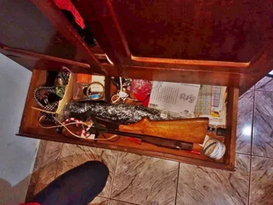 Os objetos foram encontrados dentro de um armário. Segundo a polícia, o morador confessou não ter autorização para manter a arma em casa. Ele e os objetos foram encaminhados à delegacia.