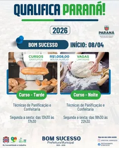 A Prefeitura de Bom Sucesso, em parceria com o Senai Paraná, está com inscrições abertas para o curso de qualificação em Técnica de Panificação e Confeitaria. O programa oferece uma bolsa-auxílio no valor de R$ 1.008,00 para os alunos participantes, com o objetivo de fomentar a geração de renda e a profissionalização da mão de obra local. As aulas estão previstas para começar no dia 8 de abril de 2026.
