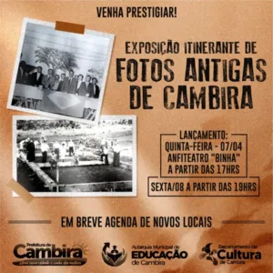 Como parte da programação festiva, o Departamento de Cultura de Cambira lança, também nesta quinta-feira, a Exposição de Fotografias Antigas. As imagens fazem parte do acervo municipal e de familiares do nosso Município, e traçam um perfil histórico de Cambira.
