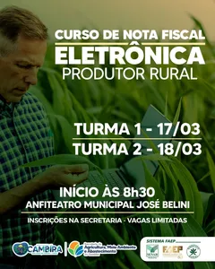 A Prefeitura de Cambira, por meio da Secretaria de Agricultura, Meio Ambiente e Abastecimento, promove na próxima semana uma capacitação técnica sobre Nota Fiscal Eletrônica (NF-e) voltada especificamente para o produtor rural.