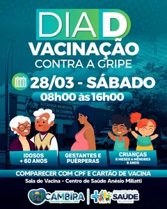 A Prefeitura de Cambira, por meio da Autarquia Municipal de Saúde, realiza neste sábado (28) o Dia D de vacinação contra a gripe. A ação acontecerá das 8h às 16h, na sala de vacina do Centro de Saúde Anésio Miliatti, com atendimento voltado aos grupos prioritários.
