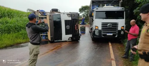 Um caminhão granjeiro tombou entre Marilândia do Sul e Rio Bom, na PR-539, na tarde desta segunda-feira (11). Chovia no momento do acidente e a pista ficou bloqueada.