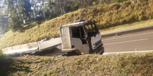 No local, o caminhão Iveco, modelo Eurotech, com placas de Campo Largo tombou e logo em seguida, destombou, ou seja, voltou à posição normal.