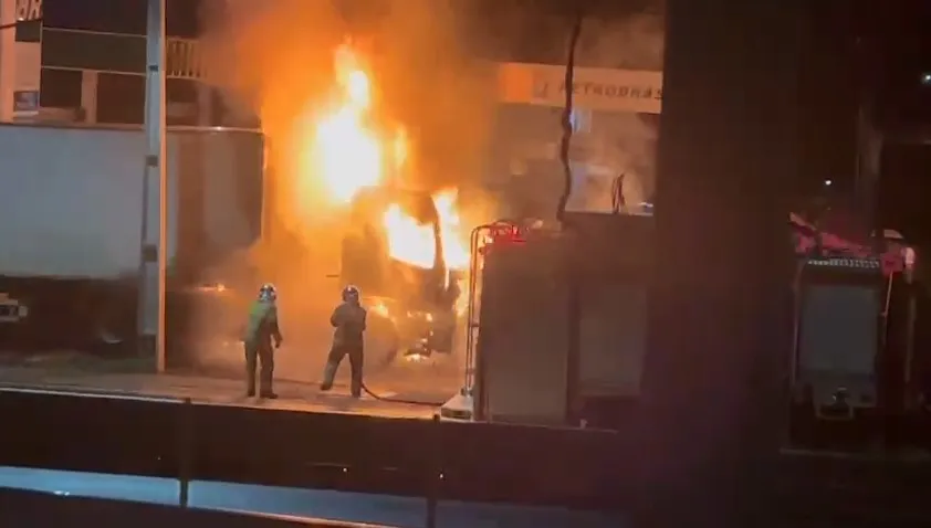 Caminhão pega fogo em posto de combustíveis em Mauá da Serra; vídeo