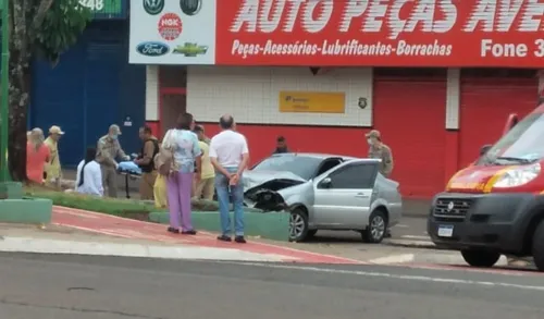 Com o impacto da batida o Corsa colidiu com um poste em frente a Rodap Auto Peças.