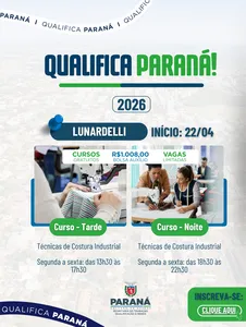 O município de Lunardelli, por meio do programa Qualifica Paraná 2026, está com inscrições abertas para o curso gratuito de Técnicas de Costura Industrial. A formação, que visa capacitar profissionais para a indústria têxtil, oferece uma bolsa-auxílio de R$ 1.008,00 para os alunos selecionados. As aulas têm início confirmado para o dia 22 de abril de 2026.