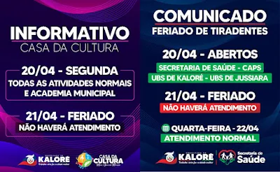 A Prefeitura de Kaloré informou o cronograma de funcionamento dos serviços públicos municipais em virtude do feriado nacional de Tiradentes, celebrado nesta terça-feira, 21 de abril. O atendimento ao público seguirá um esquema especial, com interrupção das atividades administrativas no feriado e retorno normal na quarta-feira (22).