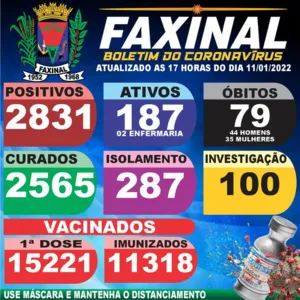 A saúde de Faxinal confirmou que mais 56 pessoas testaram positivo para Covid-19 nesta terça-feira (11). No total são 2.831 diagnósticos da doença, desde o início da pandemia.