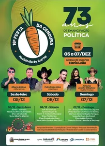 A 16ª edição da Festa da Cenoura começa nesta sexta-feira (5) em Marilândia do Sul, marcando as comemorações dos 73 anos de emancipação política do município. O evento, que segue até domingo (7), será realizado no estacionamento do ginásio de esportes e contará com uma programação diversificada que inclui shows nacionais gratuitos, atrações gastronômicas e atividades de lazer.