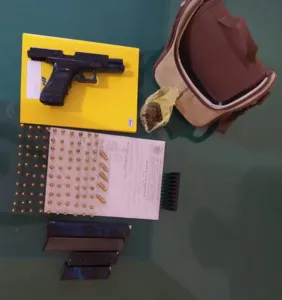 De acordo com a equipe policial, o suspeito foi abordado em seu veículo, um VW Gol com placas de Castro. Ele estava com um casal. No interior do veículo foram localizados uma pistola Glock, modelo G17 suprimida, uma bolsa com 106 munições intactas e 7,9 gramas de maconha.