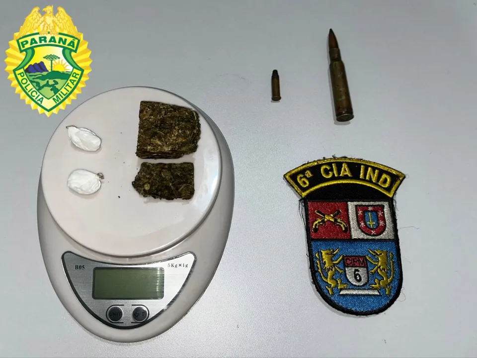 Durante a ação, a equipe da RPA encontrou 1g de cocaína, 15g de maconha e duas munições, uma de calibre .22 e outra de calibre .556