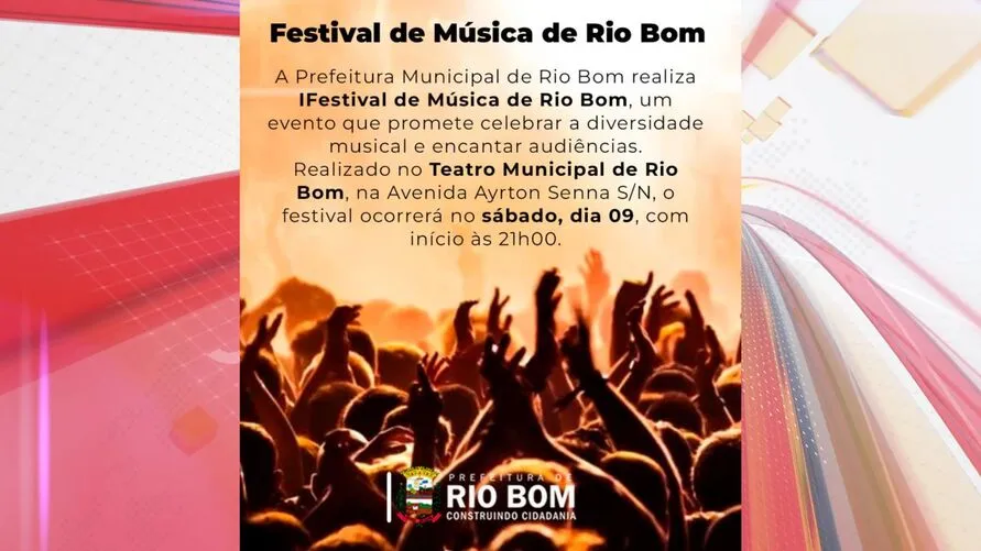A Prefeitura Municipal de Rio Bom (PR) realiza no próximo final de semana o I Festival de Música de Rio Bom, um evento que promete celebrar a diversidade musical e encantar audiências. Realizado no Teatro Municipal de Rio Bom, na Avenida Ayrton Senna S/N, o festival ocorrerá no sábado, dia 09, com início às 21h00.