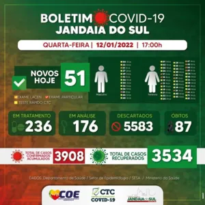 Nesta quarta-feira (12), a Saúde de Jandaia do Sul informou que mais 51 pessoas testaram positivo para a Covid-19. Não houve novos óbitos registrados.